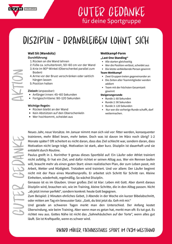 Einmal im Monat veröffentlichen wir an dieser Stelle einen kurzen geistlichen Impuls – klar, alltagsnah und direkt umsetzbar. Dazu gehört immer eine passende sportliche Aktion: eine kleine Challenge, eine Übung oder ein Teamformat, welches das Thema nicht nur hörbar, sondern erlebbar macht.